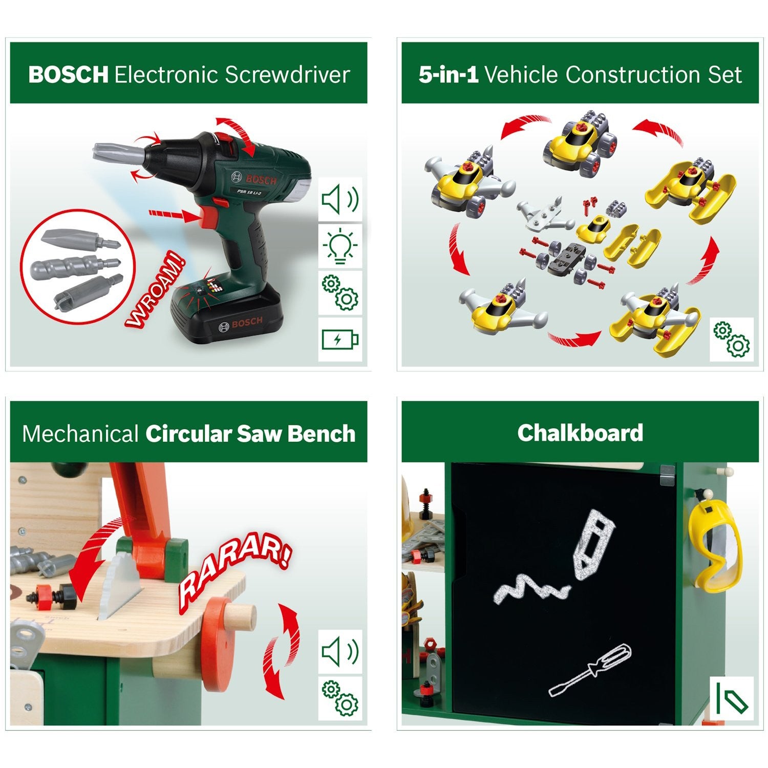 The height-adjustable children's workbench is made of wood in the popular Bosch design. The worktop offers many learning functions as well as practical storage areas for the battery-powered Bosch cordless screwdriver and the cool mechanical circular saw with sound effects. The numerous accessories can be stored under the worktop - on the shelves, in the drawer and in the robust toolbox there is enough room for screwdrivers and wrenches, hammers, pliers, saws, squares, tape measures, vise as well as screws, nuts and threaded elements in various sizes and shapes. Many of the children's tools can also be hung on the back wall using the practical hooks. The helmet and safety gloves are particularly popular with the little craftsmen, as are the 5-in-1 assembly vehicle and the write-on door on which construction plans or tasks can be written down (the chalk is not included).