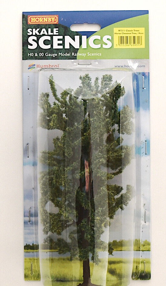 This Horse Chestnut Tree from Hornby is designed to add realistic greenery to your railway landscape. The detailed model tree creates an authentic natural element for your diorama or layout, helping to establish scale and context. Featuring green foliage and a realistic trunk, this large scenic accessory adds to the visual appeal of rural or urban settings in your world.
