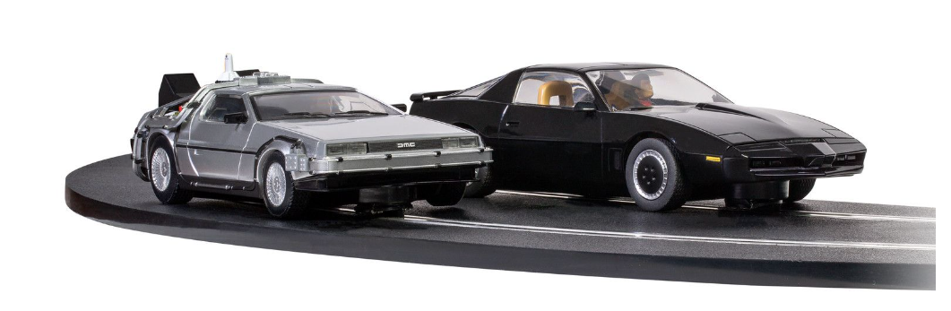 Two of the most iconic film cars ever go head-to-head in this brand-new set from Scalextric! Will you be Michael Knight in K.T.T.? Or Doc or Marty McFly in the Back to the Future Time Machine??Whether you are doing 88MPH or chasing down bad guys, red LED lights flashing on?either car is a guaranteed winner on the big screen, small screen or Scalextric track! This set contains everything you need to race Scalextric, including two cars, power, over 5.3 metres of track including a crossover, side swipe and 2 easy speed limiting hand controllers.